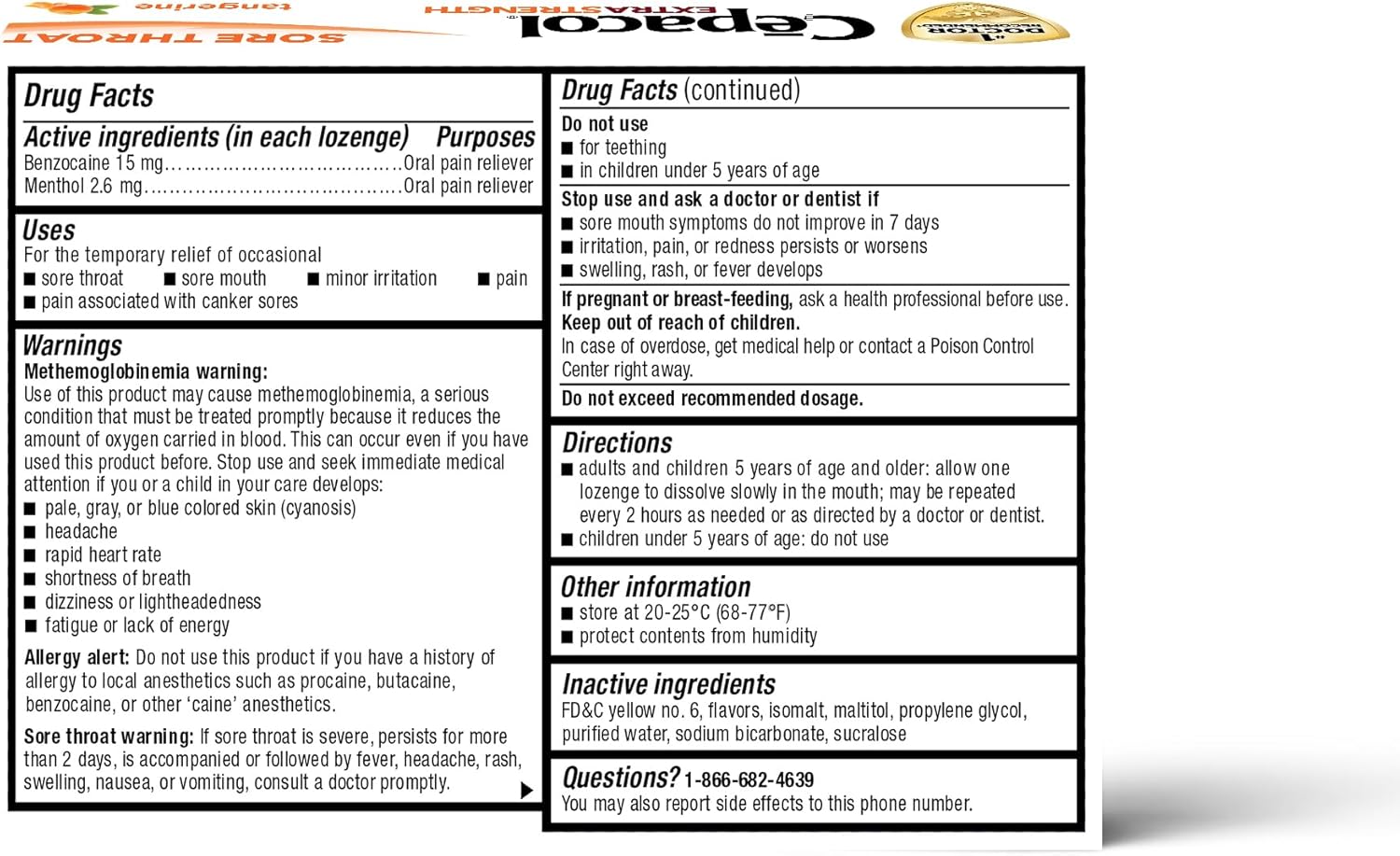 Cepacol Extra Strength Sore Throat Relief Lozenges, Honey Lemon Cough Drops, Maximum Numbing- Fast Acting Sore Throat, Mouth & Canker Sore Pain Relief with Benzocaine & Menthol, 16 Count