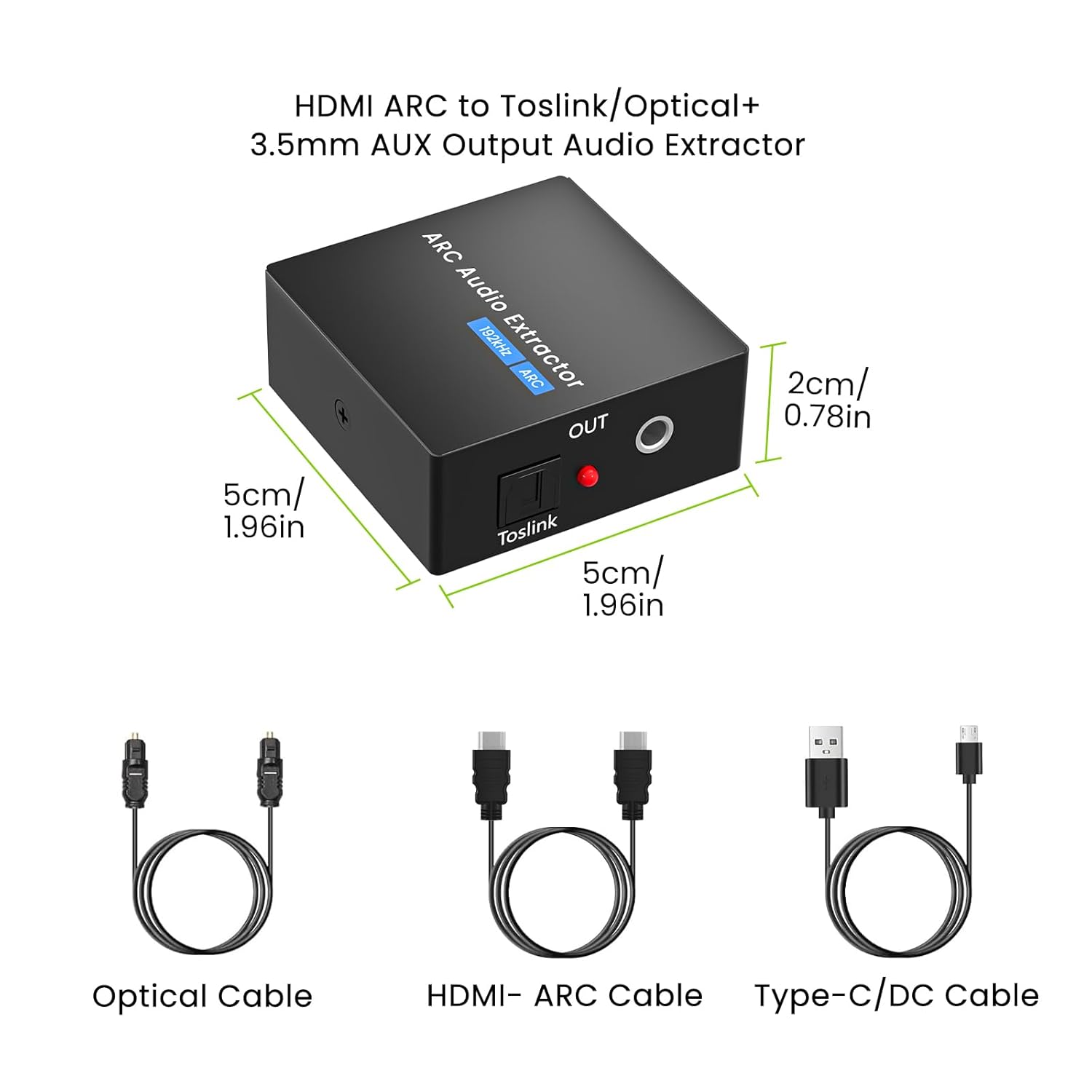192KHz ARC Audio Extractor, HDMI ARC to Optical Converter, ARC to Optical/Toslink+3.5mm AUX Output, ARC to RCA Audio Converter for TV Amplifier Speaker/Soundbar/Headset
