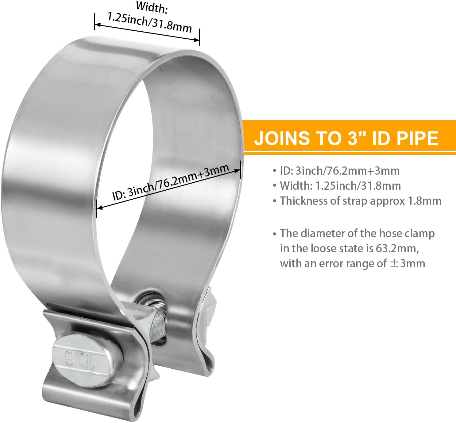 TIROL 3 Exhaust Clamp 3 inch Exhaust Clamp Stainless Steel Narrow Band Muffler Clamp for 3" OD Exhaust Pipe, Muffler Pipe 2Pcs