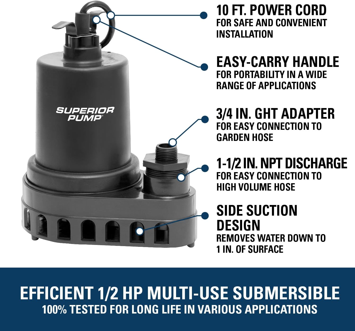 Superior Pump 91570 3300GPH Thermoplastic Submersible Utility Pump with 10-Foot Cord, 1/2 HP