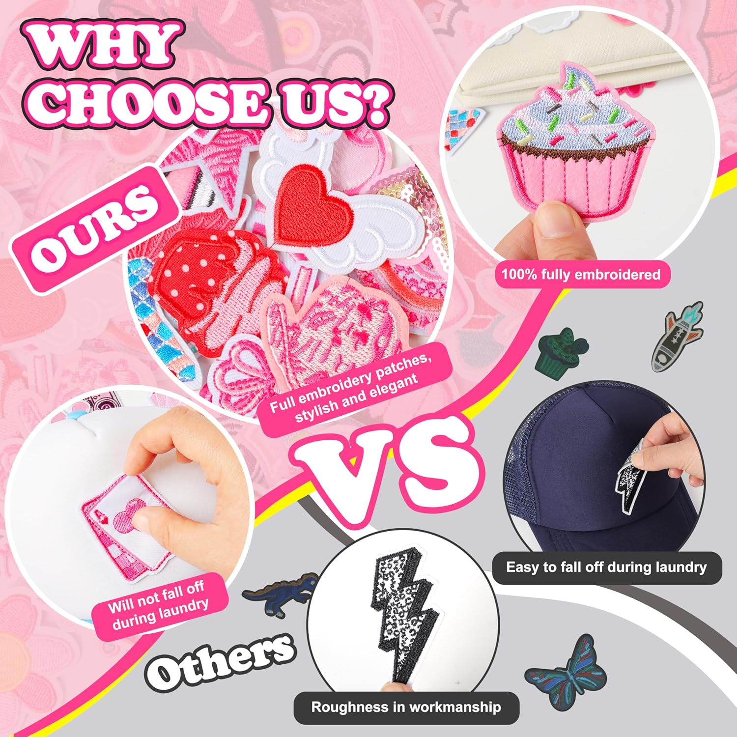 NICEVINYL Pink Iron on Patches for Girls: 60PCS Girly Random Embroidery Patches for Backpacks Clothing Hats Jackets Pants Decor - Assorted Cute Sew on Appliques for DIY Accessories