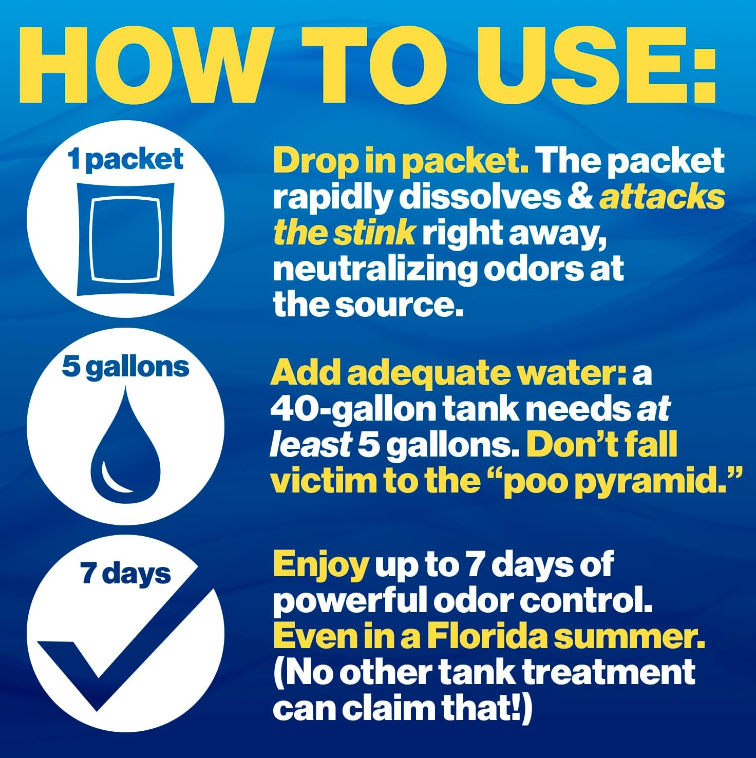 - •VERSATILE FOR ALL TANKS - Our marine and RV tank deodorizer for black tank cleans tanks from 2.5 gallons - 40 gallons. Ideal for RVing, boating, boondocking, and portable camping cassette toilets.