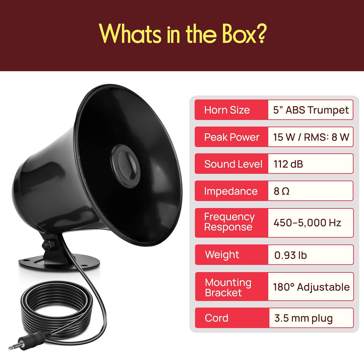 Pyramid Model : SP5 All Weather 5'' PA Mono Extension Horn Speaker 5" Reflex ABS Horn 8 Watts RMS Nominal Power 15 Watts Peak Maximum Power 8 Ohms Impedance Frequency Response: 450~5,000Hz Output: 112dB 180° Swiveling Adjustable Bracket 10' Pre-Wired Cord with 3.5mm Mono Connector