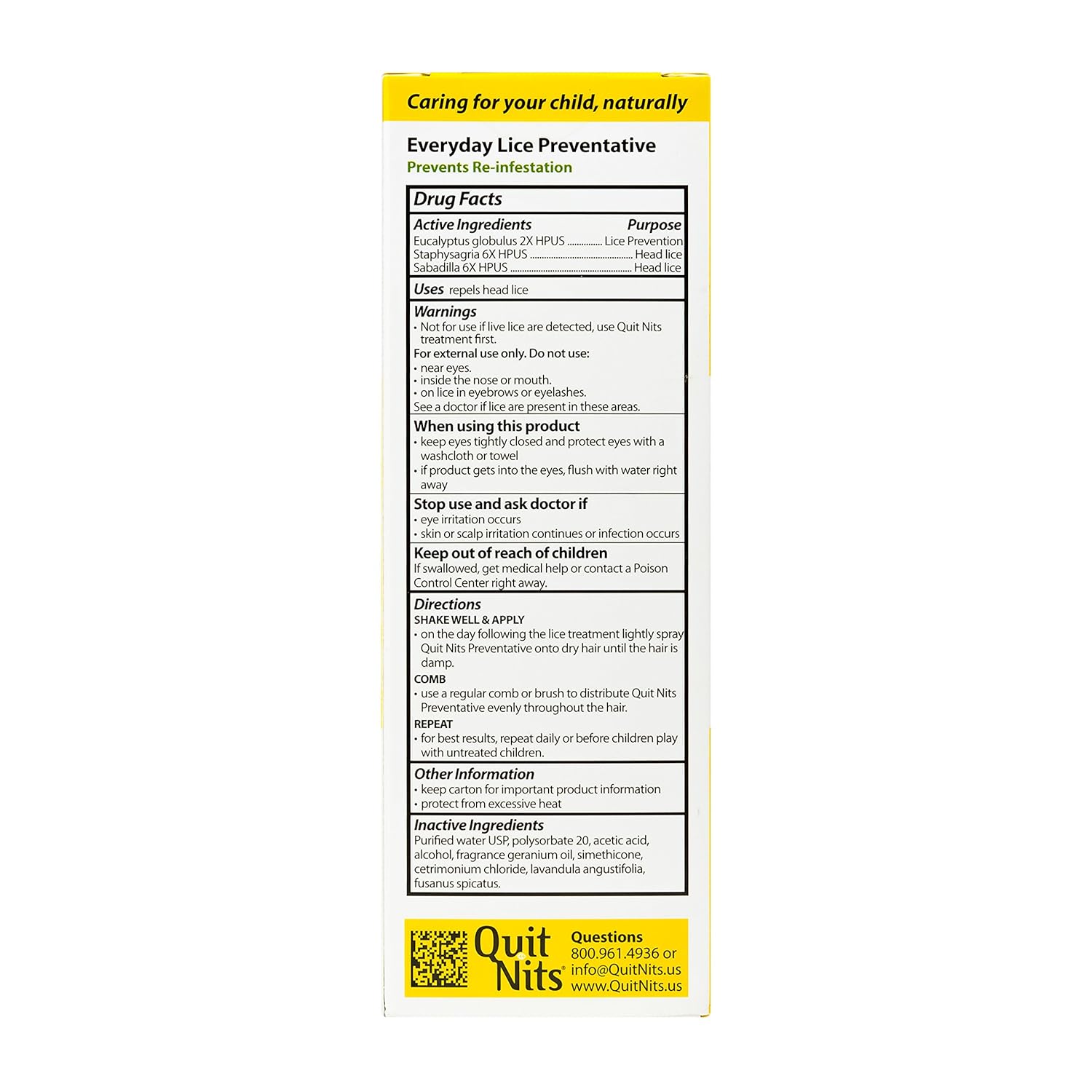 El spray preventivo diario Quit Nits ayuda a prevenir la infestación de piojos tanto antes de la exposición como una medida proactiva y después de la infestación para evitar la repetición de la infección. תרסיס מונע לשימוש יומיומי של Quit Nits מסייע במניעת התלקחויות כינים הן לפני החשיפה כאמצעי יזום והן לאחר ההדבקה כדי למנוע התרחשות חוזרת. Quit Nits Everyday Preventative Spray verhindert Läusebefall sowohl vor der Exposition als proaktive Maßnahme als auch nach dem Befall, um ein erneutes Auftreten zu vermeiden. يساعد البخاخ الواقي للاستخدام اليومي من كويت نيتس على منع الإصابة بالقمل قبل التعرض كإجراء استباقي وبعد الإصابة لتجنب الإصابة مجددًا. O spray preventivo diário Quit Nits ajuda a evitar infestação de piolhos antes da exposição como uma medida proativa e após infestação para evitar reocorrência. Quit Nits 日常预防喷雾有助于防止虱子侵扰,作为积极措施暴露前和感染后,以免再次发生。 Quit Nits 에브리데이 예방 스프레이는 사전 조치로 노출 전과 감염 후 이가 감염되는 것을 방지하여 재발을 방지합니다.