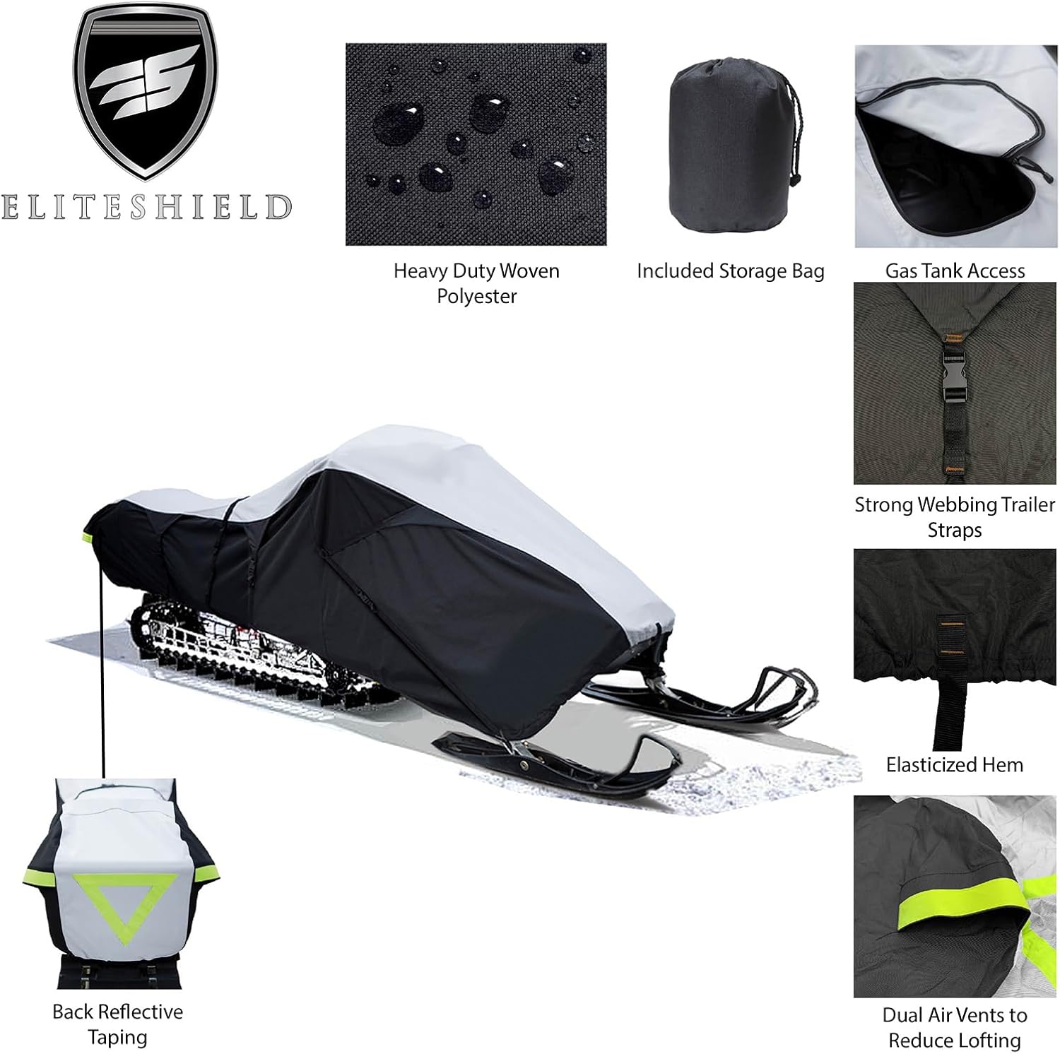 The Eliteshield Pro Shield snowmobile ensures unparalleled protection against rain, sun, snow, dust and dirt. Crafted from top-tier, fully waterproof polyester that's gentle on your snowmobile's finish and allows for breathability. It's full elastic hem provides a secure, snug fit, while air vents minimizes condensation and wind lofting. It's made with solution-dyed, fade-resistant fabric along with build-In straps for durability and convenience. A rear reflective safety sign for visibility; A Zipper fuel tank access panel makes it easy to reach the fuel cap without removing the entire cover. The cover comes with a storage bag for easy storage when not in use. Made of durable 600D polyester. Protect your snowmobile from rain, sun, snow, dust and dirt. UV treated and 100% waterproof for all weather protection. Integrated trailering system with built-in quick adjusting straps tightly secure cover for storage or trailering. Measure from the front nose of the snowmobile to the back of the rear bumper