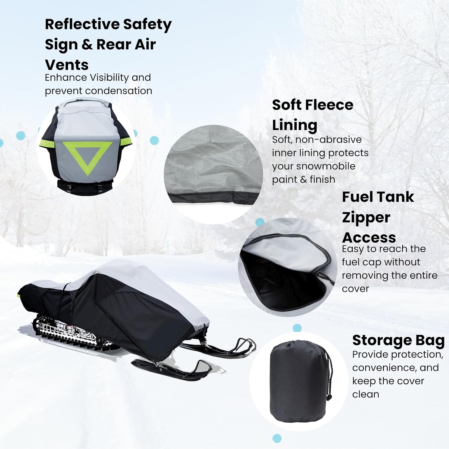 - •*[Convenient Design]: A Zipper fuel tank access panel makes it easy to reach the fuel cap without removing the entire cover; Storage bag for easy storage when not in use; **Measure from the front nose of the snowmobile to the back of the snowmobile-Skis not included