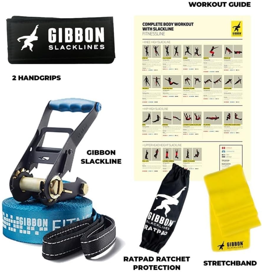 Gibbon Slacklines Fitness Line, Blue, 15m, 12,5m line + 2,5m Ratchet Strap, for Starters, Beginners and Fitness Enthusiasts, incl. Ratchet Protection and Ratchet with Safety Lock, 50mm/2" Wide