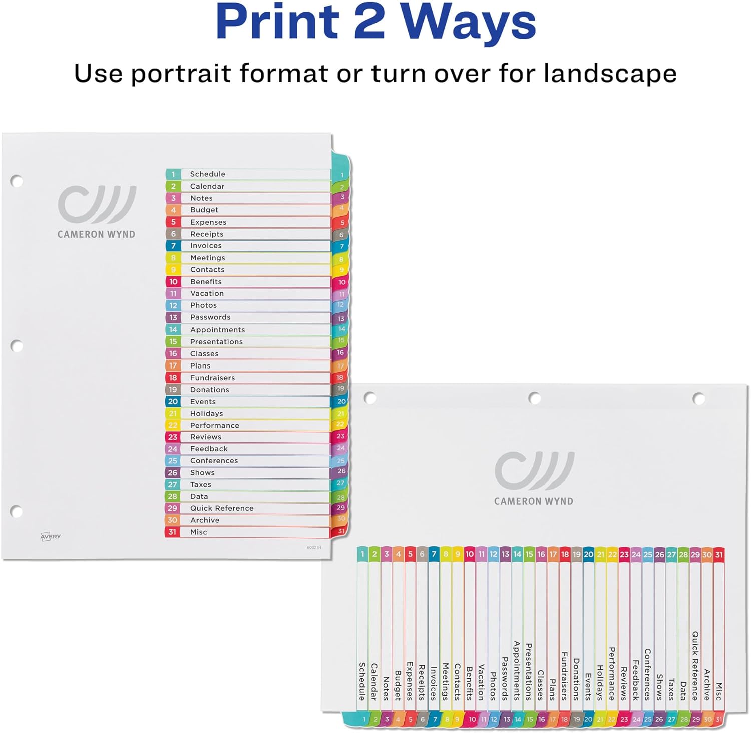 Give your binders a fresh new look with Avery Ready Index Dividers. Each binder divider features a contemporary and bright color scheme with a larger arched tab. Print customized section titles and images onto the table of contents sheet without worrying about inserts or labels. Whether you’re hosting a meeting or creating binders for classes, these dividers are perfect for getting things sorted. 31 tab dividers are included with each sheet measuring 8-1/2”x11”. The heavyweight sheets feature durable, reinforced 3 ring binder holes to help prevent tearing. Each tabbed divider also includes additional reinforcement along the edge of the sheet to distribute stress and resist creasing. The table of contents sheet is also compatible with both laser and inkjet printers. Check out Avery Design & Print software today and use the available Avery templates to easily personalize your binder dividers.