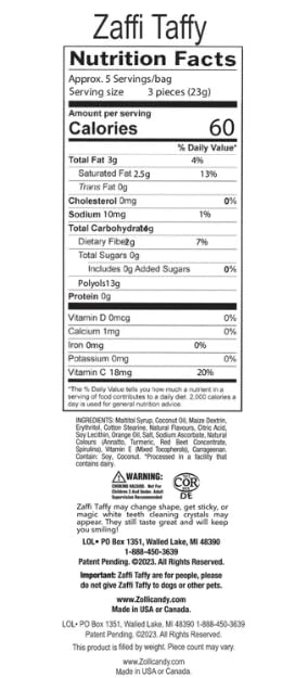 Zaffi Taffy – The Ultimate Smile-Friendly Treat for Kids and Adults Not all sugar free candy is created equal. Low-carb Taffy is a no-sugar candy that helps prevent cavities and supports dental health naturally. It helps neutralize acids and balances pH levels in the mouth. This means healthy oral health and fresher breath after every treat. Zaffi Taffy are dentist-approved clean teeth treats for kids offering a tasty way to maintain oral health. These treats make keeping smiles fresh and clean easy—perfect for daily enjoyment without the sugar. Q: What makes Zaffi Taffy different from other sugar-free candies? A: Zaffi Taffy uses erythritol and natural sweeteners for a clean, fruity sweetness—without artificial dyes or gluten. Unlike regular candy, it helps reduce acidity after meals, supporting oral health naturally. Q: Who can enjoy them? A: Zaffi Taffy is inclusive and safe for nearly everyone. These chewy, fruity treats are also perfect for adults. They are allergy friendly - gluten-free, dairy-free, nut and peanut free. Whether you’re searching for healthy snacks for kids or diabetic-friendly sugar-free candy for oral health, Zaffi Taffy is the healthy smile candy that delivers the taste of fruity candy with the benefit of clean teeth support. Q: Are they only for kids? A: Absolutely not. Zolli Candy is just as great for parents, teachers, and health-conscious adults. If you’ve ever wondered, “What sugar-free candy is good for teeth and diabetics?” the answer is Zolli Candy. They’re a keto diet friendly candy that supports oral wellness, making them perfect for families who want both enjoyment and health benefits from their sweets. Q: How are Zollipops packaged? A: Each Zaffi Taffy candy is individually wrapped. This sugar free candy is convenient for lunchboxes, classrooms, birthday parties, and travel. Whether used as party candy for kids’ goodie bags, healthy rewards, or post-meal treats, they provide a delicious fruity burst without the sugar crash. Q: Do they contain vitamins or supplements? A: Yes! Zaffi Taffy is fortified with Vitamin C, adding a little boost of wellness to every chewy bite. While it’s not a replacement for daily vitamins, it’s a smile-friendly candy that delivers fruity flavor and a bit of nutritional support. Think of them as your daily sugar-free treat that helps keep smiles happy, mouths balanced, and wellness in check. Q: When is the best time to enjoy them? A: Anytime you want to smile! Zaffi Taffy is great after meals, during car rides, or as a reward for kids. Parents love them as clean teeth lollipops with natural sweeteners that replace sugar-filled snacks with something fun and healthy. Zaffi Taffy isn’t just candy—it’s a cause-driven, dentist-recommended treat that makes healthy living fun. It proves that sweets can be smart, safe, and supportive of smiles for kids, adults, and diabetics alike. Zolli Candy delivers a sweet treat this Halloween. These Halloween sugar free lollipops are the ultimate Halloween candy alternative sugar free treat! Kids love these spooky sugar free candy pops that double as trick or treat clean teeth pops and Halloween anti cavity candy. Perfect keto Halloween candy lollipops and diabetic friendly Halloween candy choice — a Halloween healthy candy for kids and no sugar Halloween treats everyone can enjoy. Packaging graphics may vary. Each bag is carefully filled by weight, not by piece count, so the number of candies may differ — but you’ll always receive the full, delicious, healthy treat.