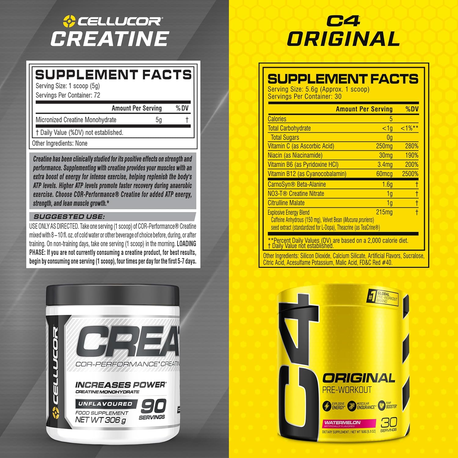 Cellucor Pre Workout & Creatine Bundle, C4 Original Pre Workout Powder, Watermelon, 30 Servings + Cor Performance Creatine Powder, 72 Servings