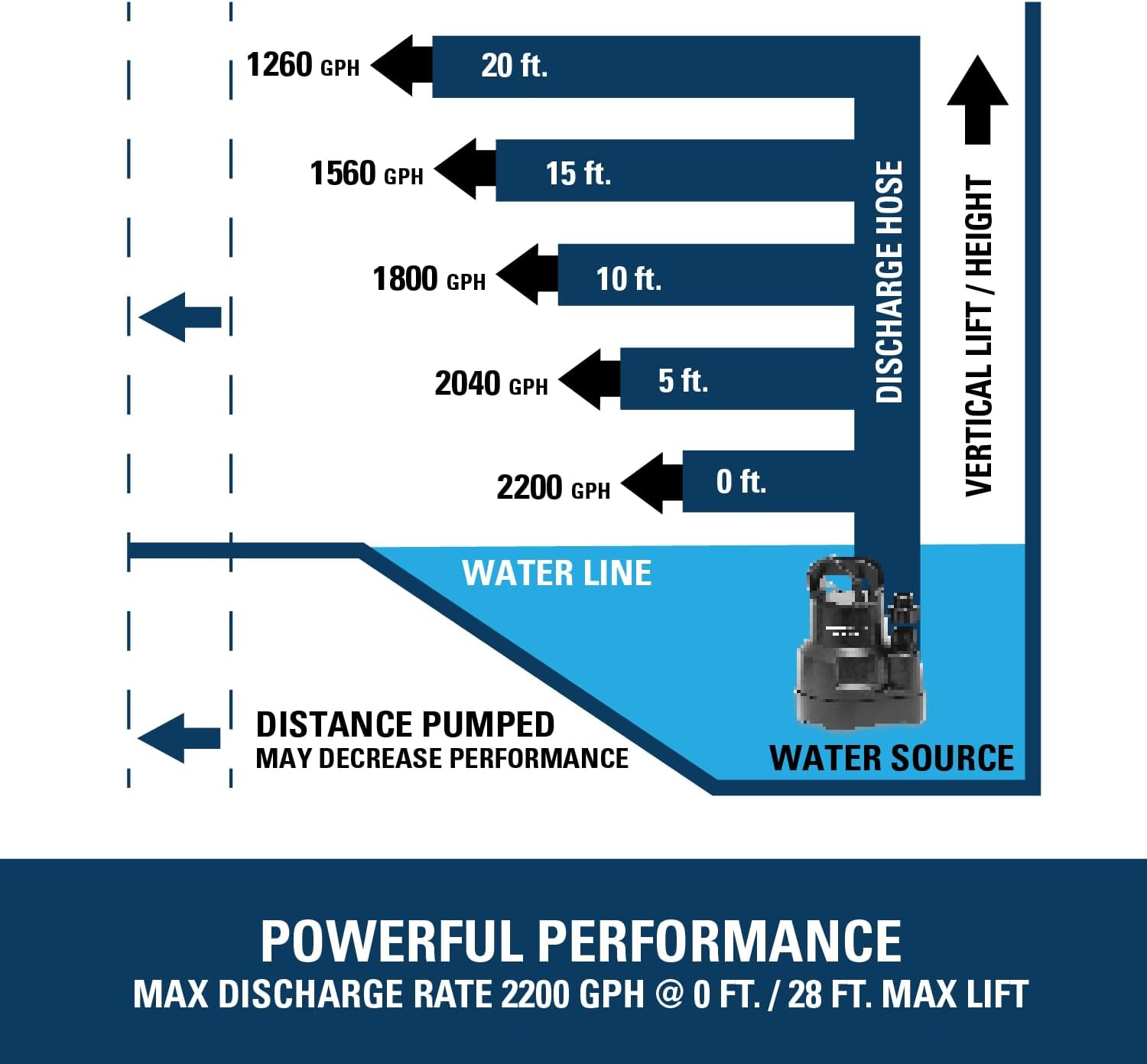 - •1/4 HP high-flow utility pump moves up to 2220 gallons per hour; pumps water up to 25-vertical feet