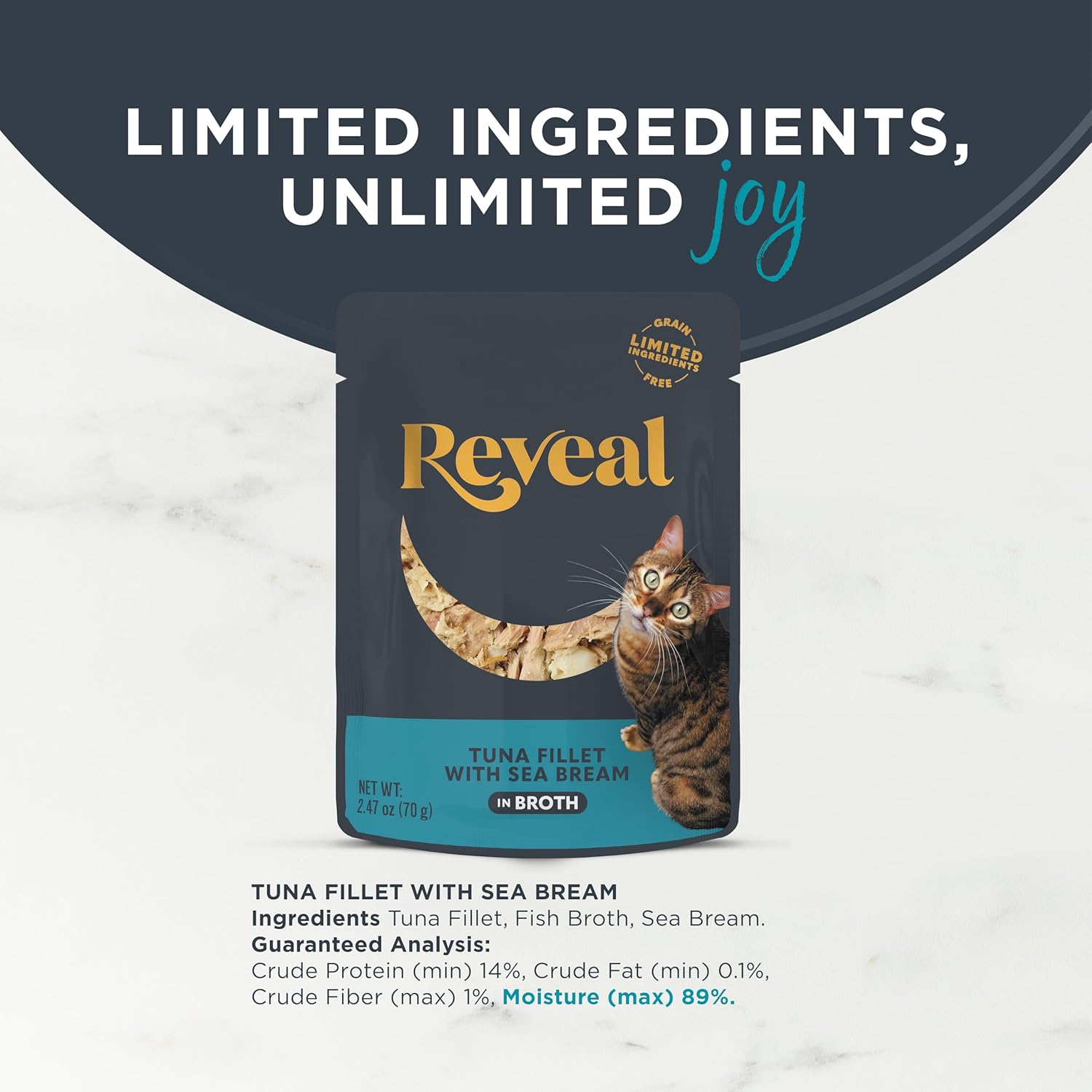 Reveal Natural Wet Cat Food, Limited and Natural Ingredients, Grain Free, High Protein with No Artificial Additives, Tuna Fillet with Seabream in Broth (12 x 2.47 oz Pouches)