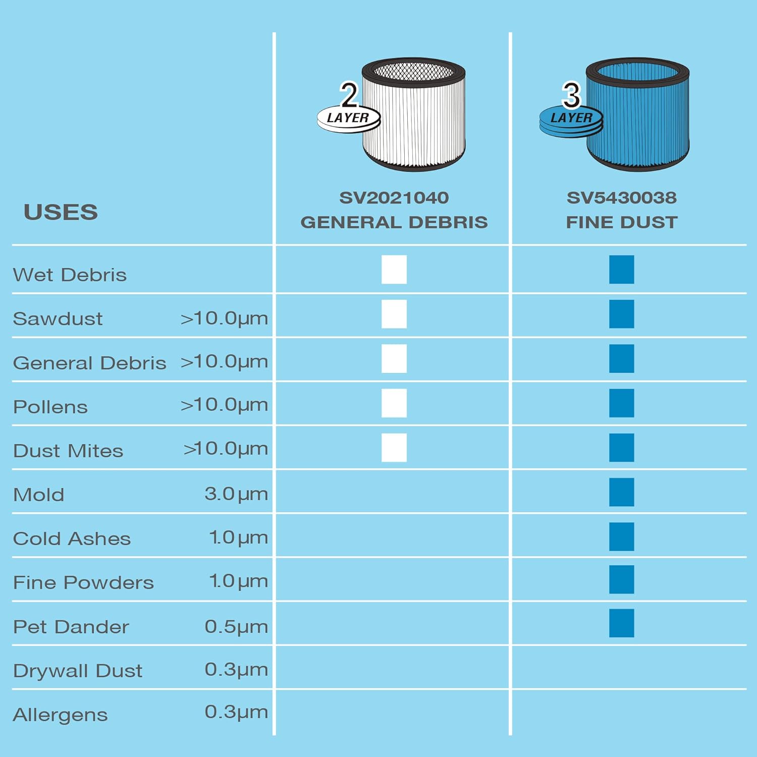 With 3-layer filter material, SV5430038 is much more efficient than normal filter. It can capture fineer dust particles.