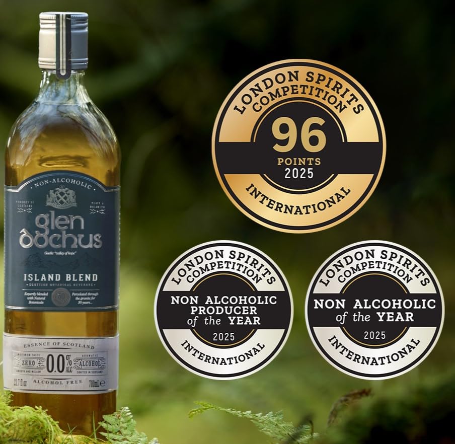 - •NON-ALCOHOLIC OF THE YEAR: Our Glen Dochus Island Blend has caught the judges' attention at numerous events. It first won a Gold 95 points at the International Wine & Spirits Competition (IWSC) in 2023, later being awarded a 2 star at the prestigious Great Taste in 2024 and finally proudly obtaining the Non-Alcoholic of the Year Award and a stunning Gold 96 points at the London Spirits Competition in 2025.