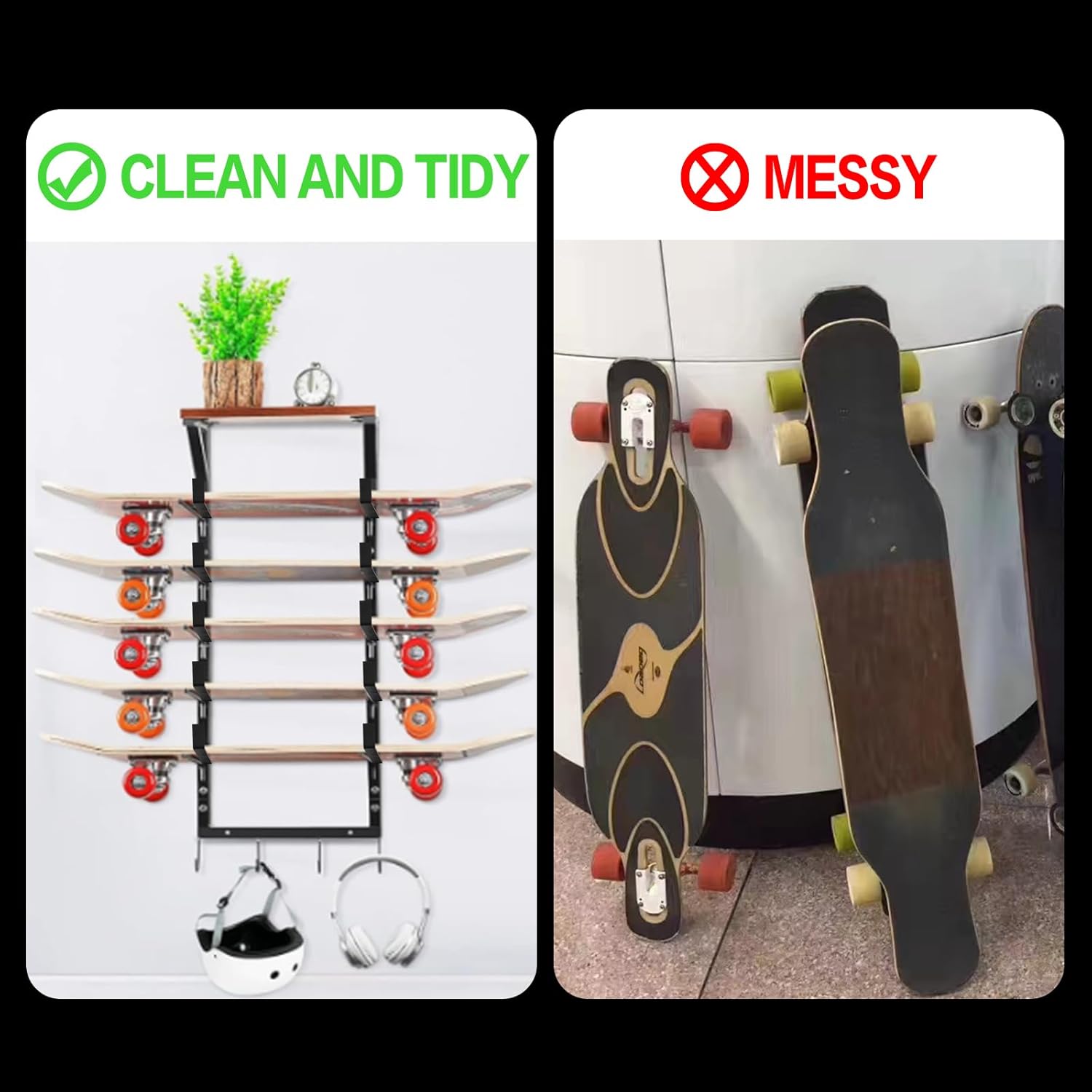 MYOYAY Skateboard Wall Mount Display 6-Layer Skateboard Wall Display Hanger Rack Suitable for Storage of All Kinds of Penny Board, Longboard, Skateboard Deck, Kids Skateboard, black