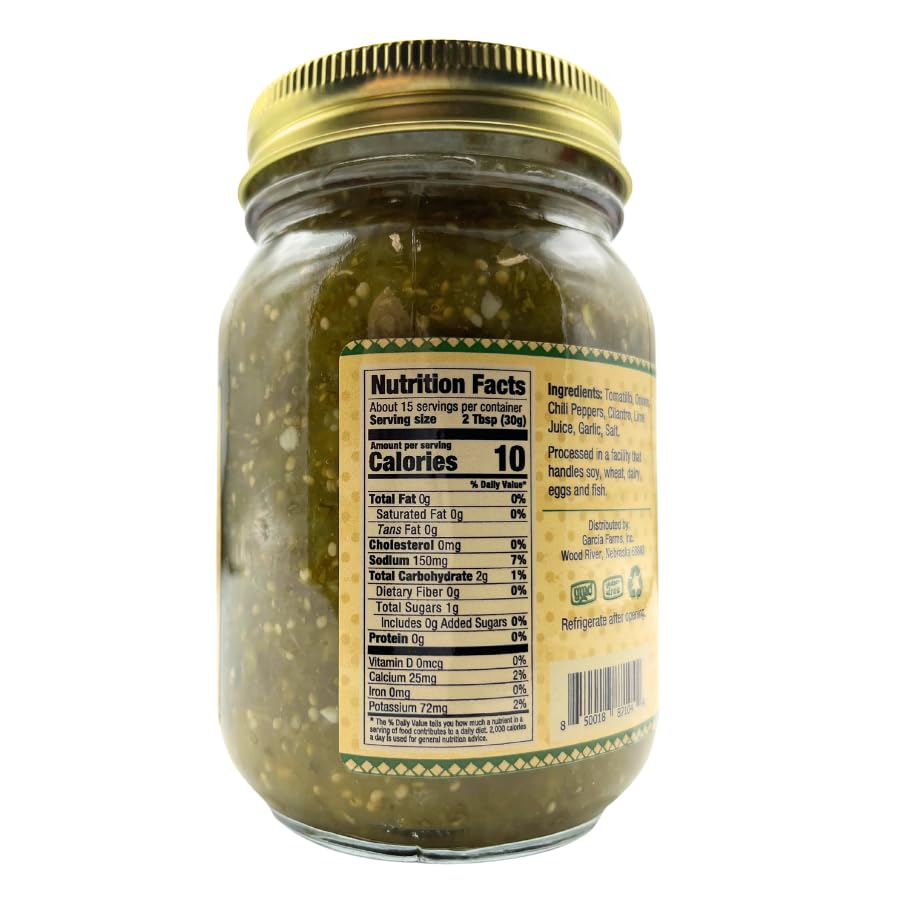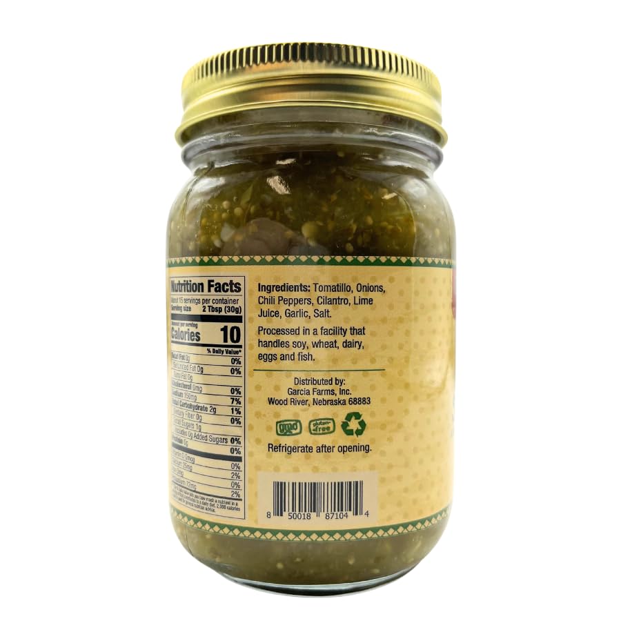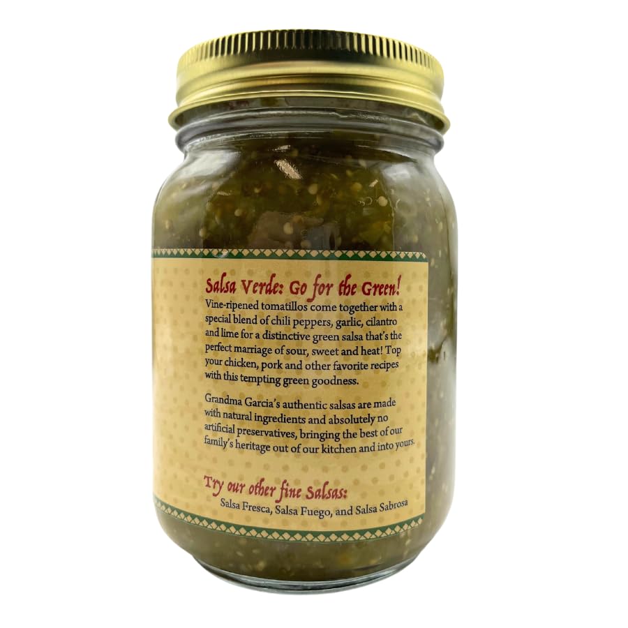 Experience zesty flavor with every bite! Vine-ripened tomatillos, chili peppers, garlic, cilantro, and lime come together in this delicious and distinctive green salsa. Sour, sweet, and spicy - it's the perfect blend for your favorite chicken, pork, and other recipes. Make every meal an unforgettable delight with Salsa Verde! About The Salsa Verde Medium Salsa: 16 oz. Jar Medium Spice Level No artificial preservatives Processed in a facility that handles soy, wheat, dairy, eggs, and fish Gluten Free No GMO Made in Nebraska Grandma Garcia's authentic salsas are made locally in Wood River, Nebraska.