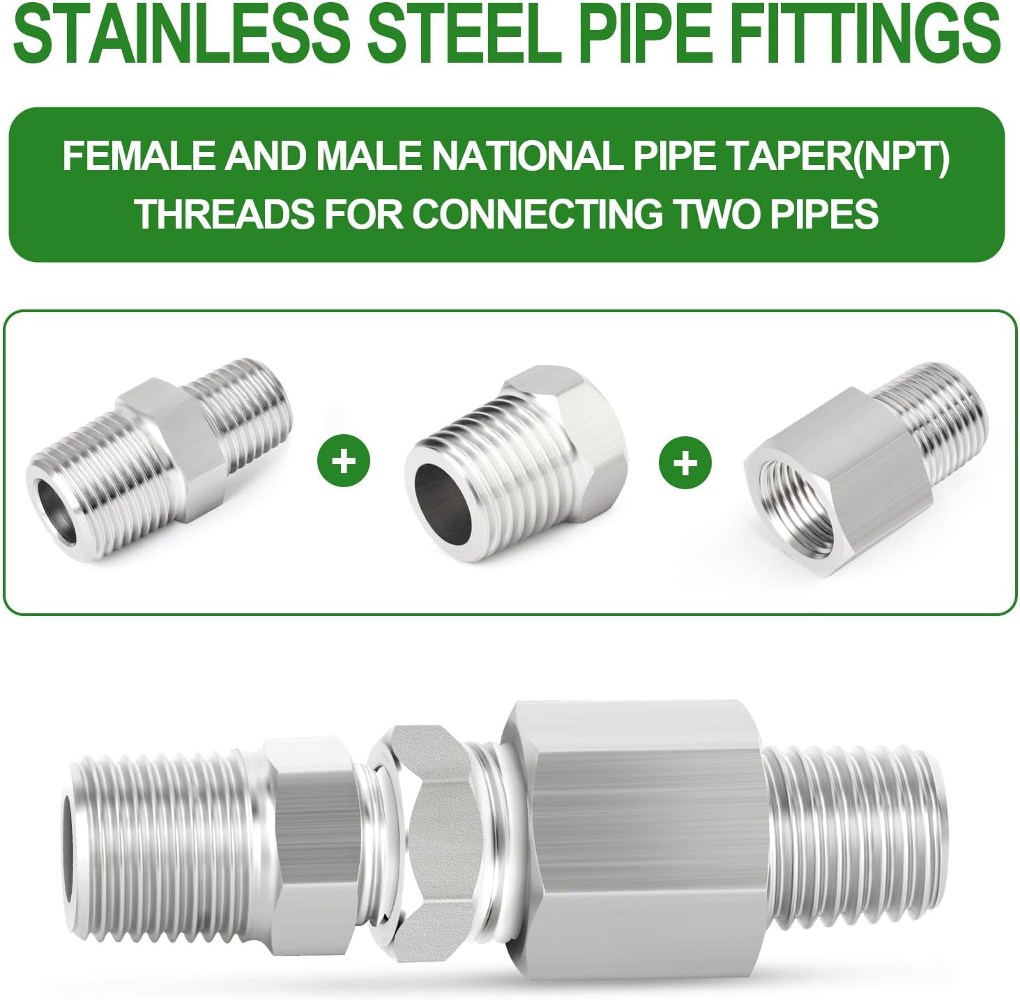 304 Stainless Steel Pipe Fitting TAISHER 304 Stainless Steel Reducer Hex Bushing , used for industrial connection of pipes or fittings of different end types, diameters or materials. It is a component used to connect, terminate, control flow and change the direction of pipelines in many different industries. It can be applied to water, air, gas, oil, fuel, refrigeration, meters, etc. (NPT thread size is not the actual diameter, it is only the nominal pipe size) For better sealing, we recommend using Teflon tape for pipe fittings. The accessory is made of 304 stainless steel, which has low temperature resistance, high temperature ductility and low magnetic permeability. Both ends are used to connect pipes of different diameters, for connection, termination and flow control. The deep thread design makes the accessory better engage with the object to enhance fixation. , established for the development of e-commerce business, mainly serves the American industrial market, is committed to producing industrial-level high-quality products. Has a professional manufacturing team, design And supporting various hardware tools, pneumatic tools, auto parts, including air hoses, high-precision pressure gauges, drills, can presses, etc. 90 Degree Elbow 90 Degree Elbow Tee Hex Bushing Coupling Hex Nipple