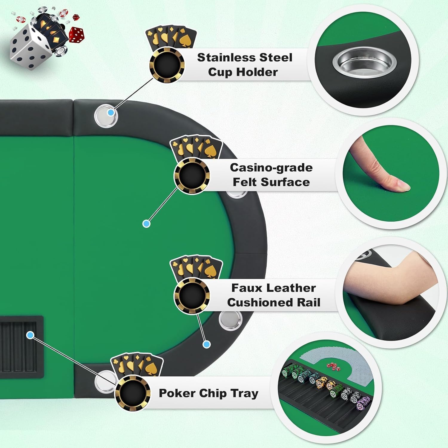 - •【Padded Rail】The professional card table features thick sponge padding wrapped in waterproof faux leather for the armrests. The exquisite and durable design provides comfortable support for your arms and body leaning, while effectively preventing spills from causing any discomfort