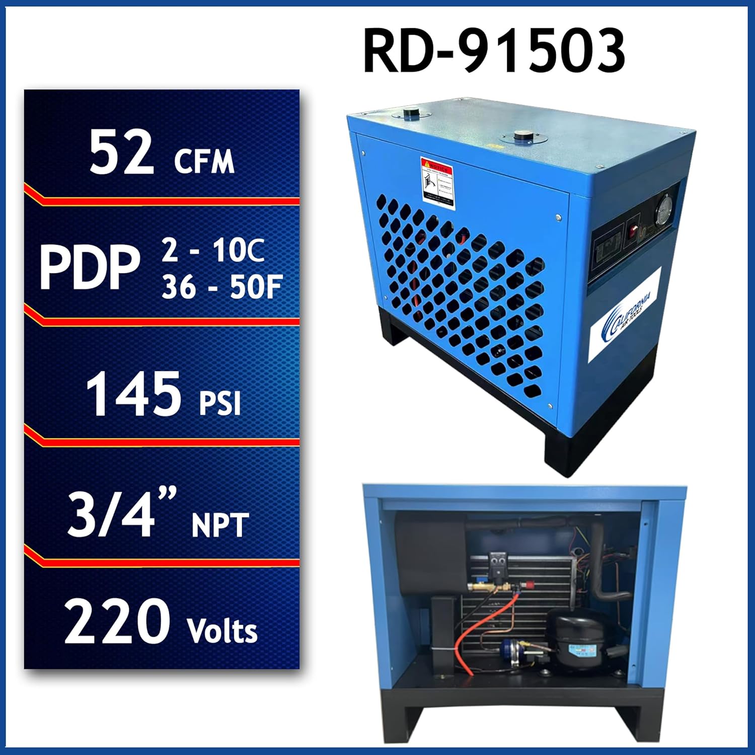 "CALIFORNIA AIR TOOLS RD-91503 High-Efficiency Non-Recycling Refrigerated Air Dryer 52 CFM 29 - 145 PSI Pressure Dew Point: 2-10C 220v 60hz 1-Phase The California Air Tools RD-91503 refrigerated air dryer (220v 60hz) typically removes around 98% of moisture from compressed air, achieving a Pressure Dew Point (PDP) between 2 - 10℃ (35.6 to 50 Fahrenheit), making it suitable for most general industrial applications where a high level of dryness is needed but not an extremely low dew point.* "