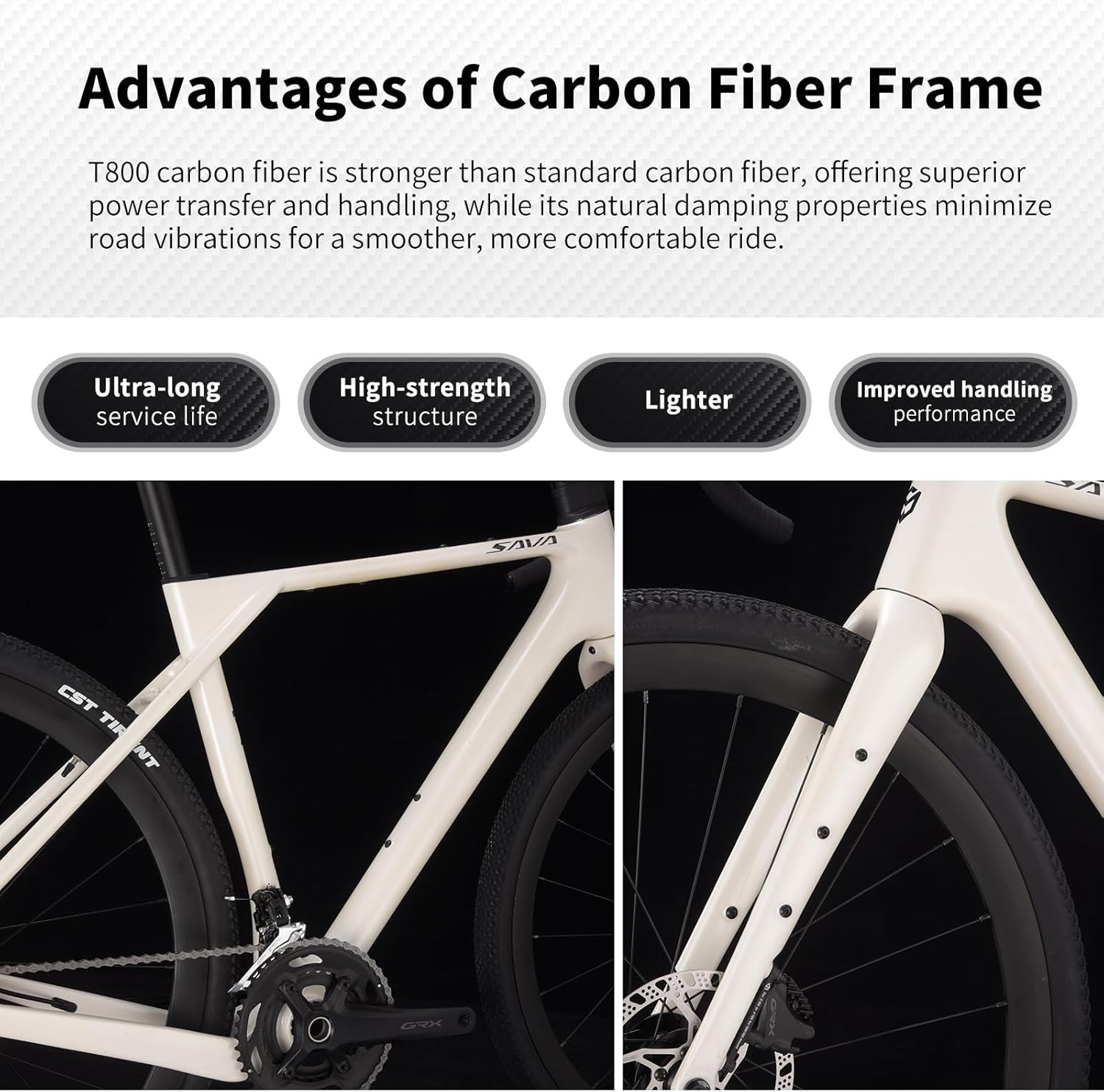 - •【Ultra-Lightweight T800 Carbon Frame】Built with a T800 R21 carbon fiber frame and fork, this bike weighs just 10.4kg (22.92 lbs) – offering 5x the strength of aluminum. Perfect for beginners, advanced riders, and enthusiasts, it’s designed for both men and women seeking a high-performance gravel bike