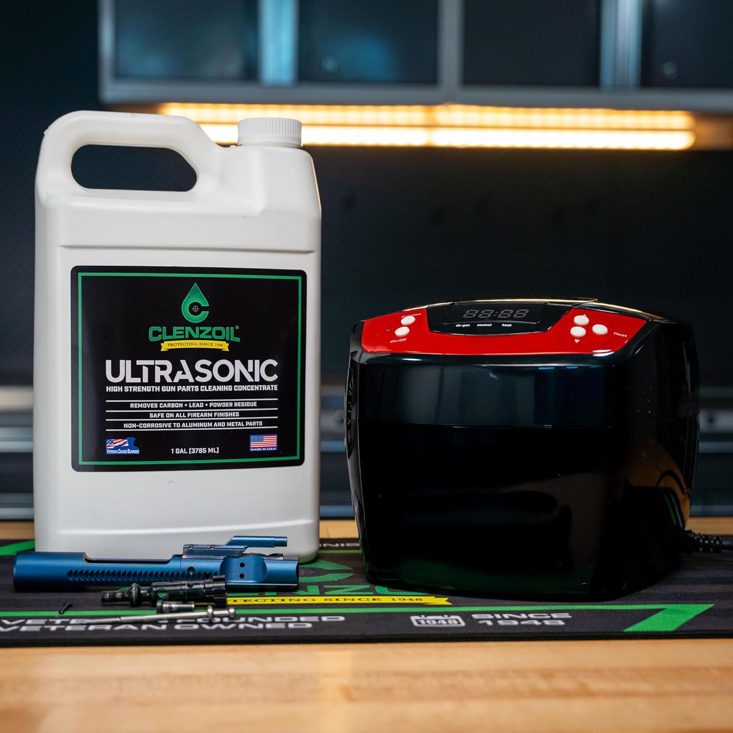 Clenzoil's Ultrasonic Solution is a potent gun parts cleaner, designed for use in ultrasonic cleaners. It effectively penetrates and removes tough carbon, lead fouling, grease, and powder residue, restoring firearm components to optimal condition. Safe for metal, aluminum, and internal assemblies, it provides a deep, comprehensive clean without causing corrosion or producing harsh fumes.