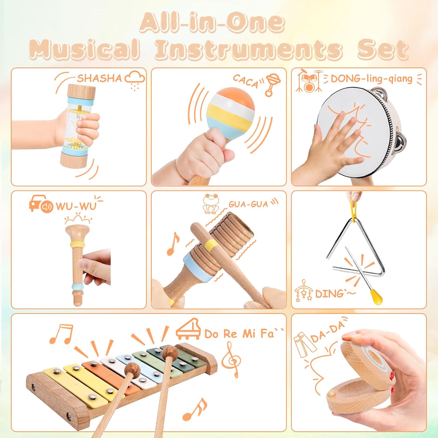 - •🥇ALL-IN-ONE MUSICAL INSTRUMENT SET:This baby musical instruments includes a xylophone, maracas, tambourine, triangle, castanets, rainmaker, wood sounder, and clarinet. Great for solo play or group fun, this toddler musical instruments encourages rhythm, creativity, and early STEAM learning—ideal for musical toys for toddlers 1–3