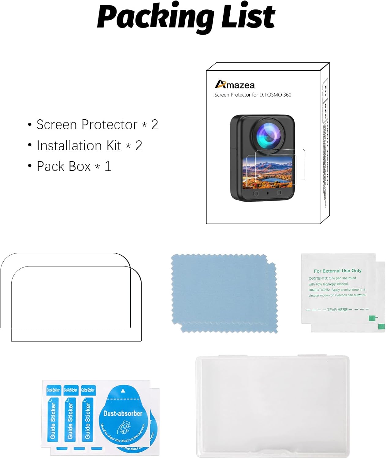 - •Packing List - 2 Osmo 360 Screen Protector, 2 Set Install cleaning tool kit