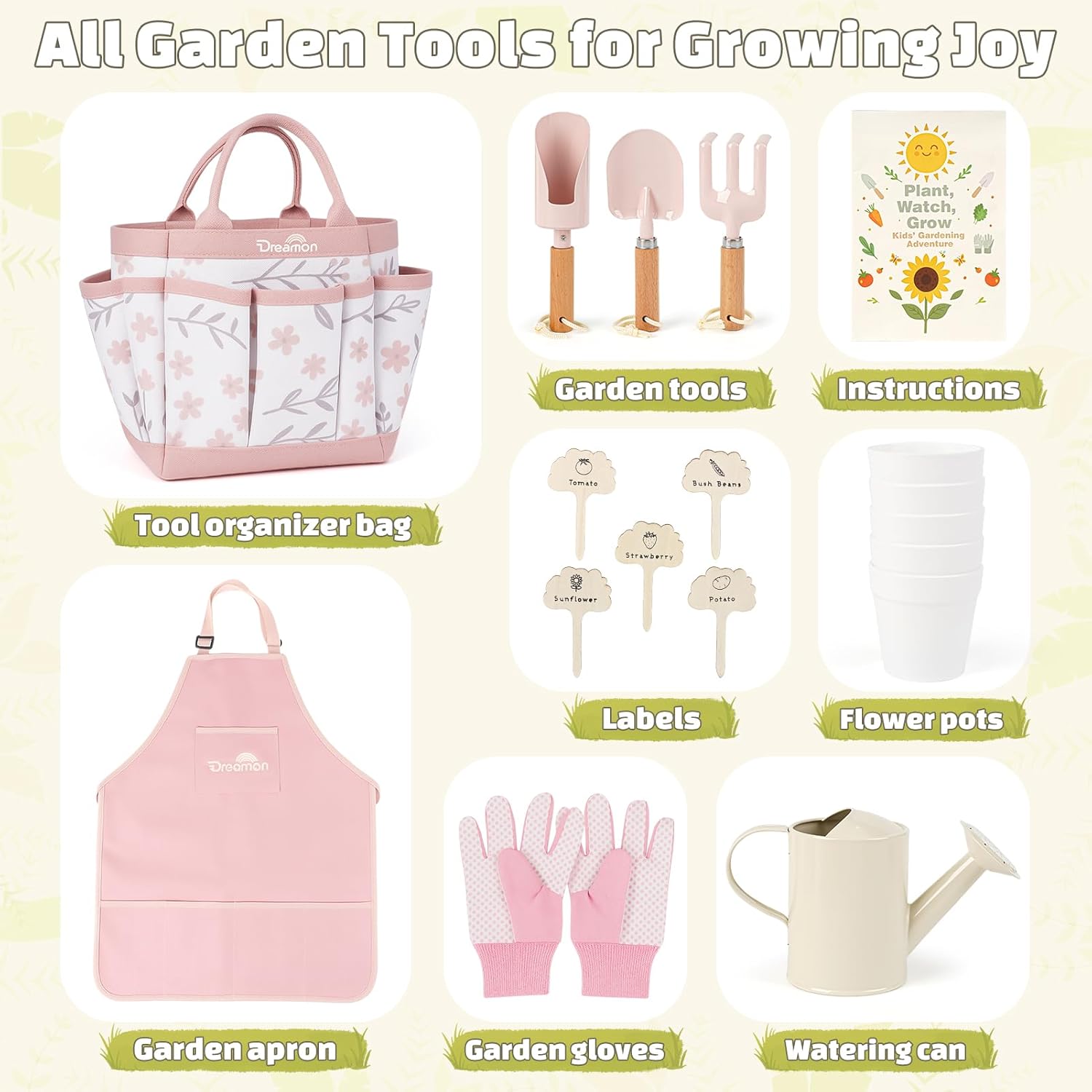 - •Complete Kids Gardening Set: All tools are specially designed for kids ages 3-6, includes a sturdy light-pink carry tote bag, garden apron, gloves, shovel, transplanter, cultivator, watering can and 5 flower pots. Perfect size and weight for little hands to dig, plant, and explore gardening safely.