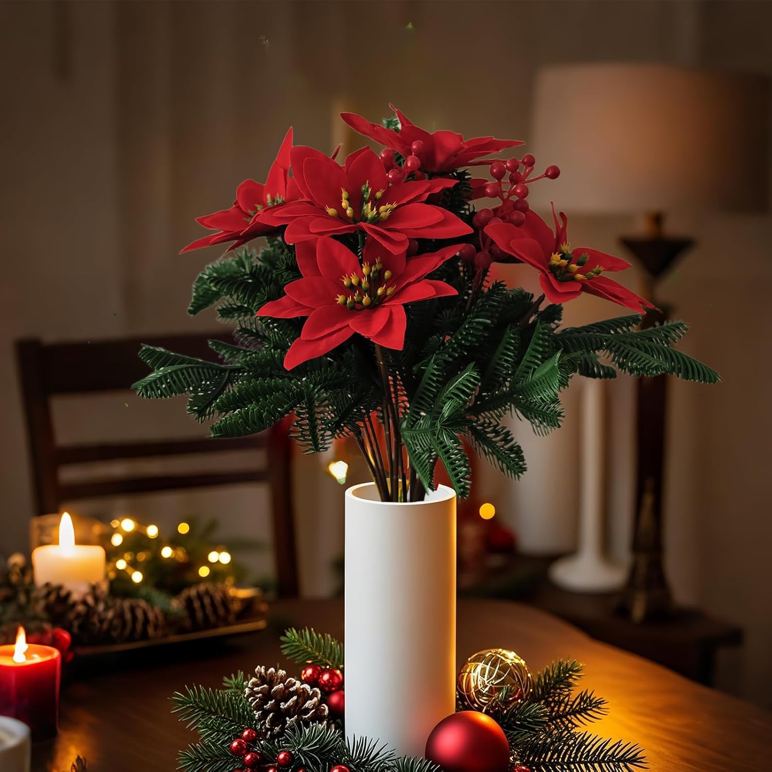 Festive Poinsettia Bouquet with Red Berries - Christmas Floral Centerpiece for Holiday Decor, Table, Mantel, Gift