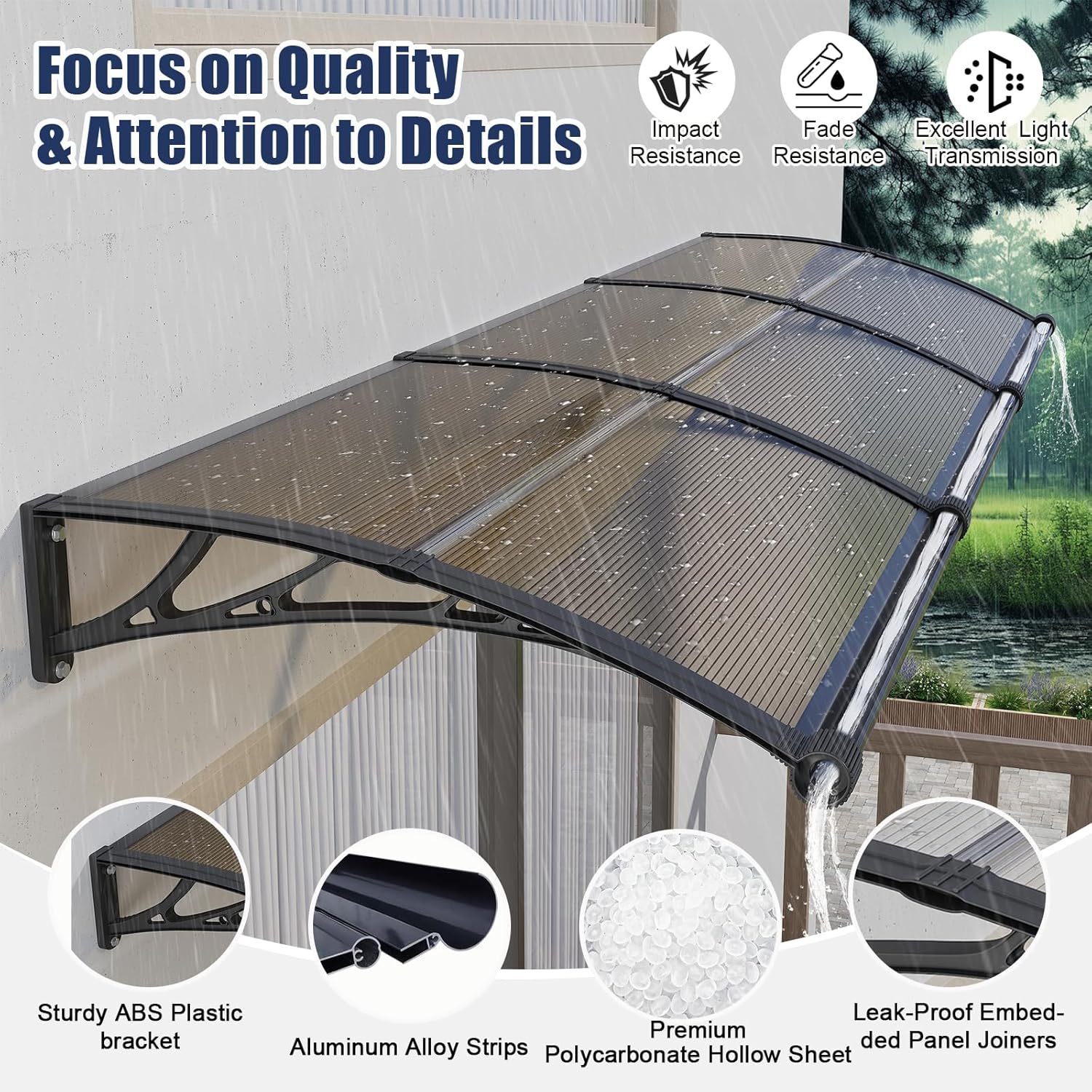 - •Sturdy and Durable: Crafted with robust ABS plastic brackets and a reinforced aluminum stripe, this awning canopy for door entrance resists rust, corrosion, and all kinds of weather. It’s built to provide years of maintenance-free protection for your entries, porches, or windows, adding both functionality and style to your home.