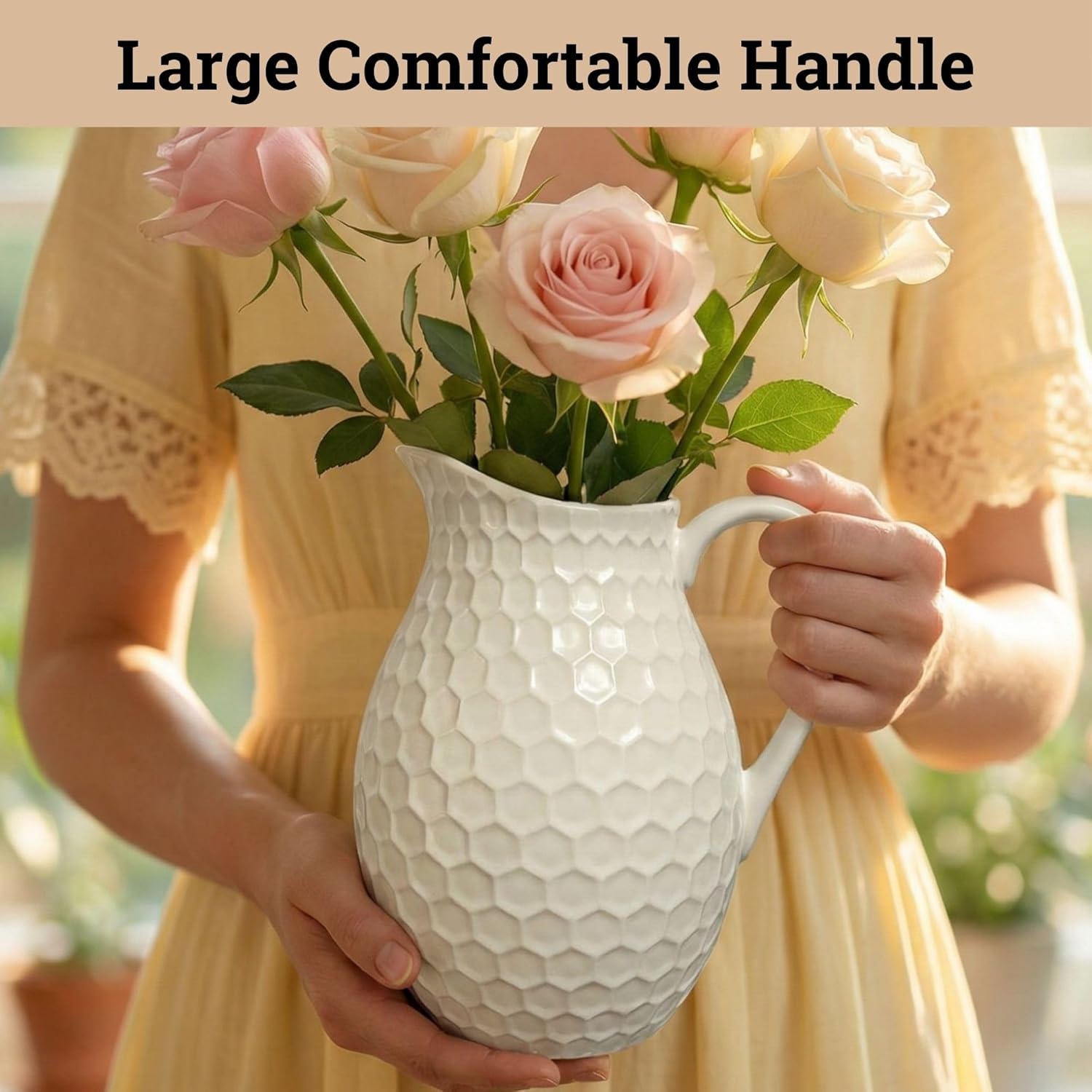 - •PERFECT SIZE CERAMIC PITCHER VASE - At 7 inches wide and 8 inches tall, this vase features a wide mouth and ergonomic handle, making it ideal for arranging fresh flowers, dried flowers, dried stems, or pampas grass. Perfect for styling your entryway tables, kitchen counters, dining tables, farmhouse shelves, and MORE!