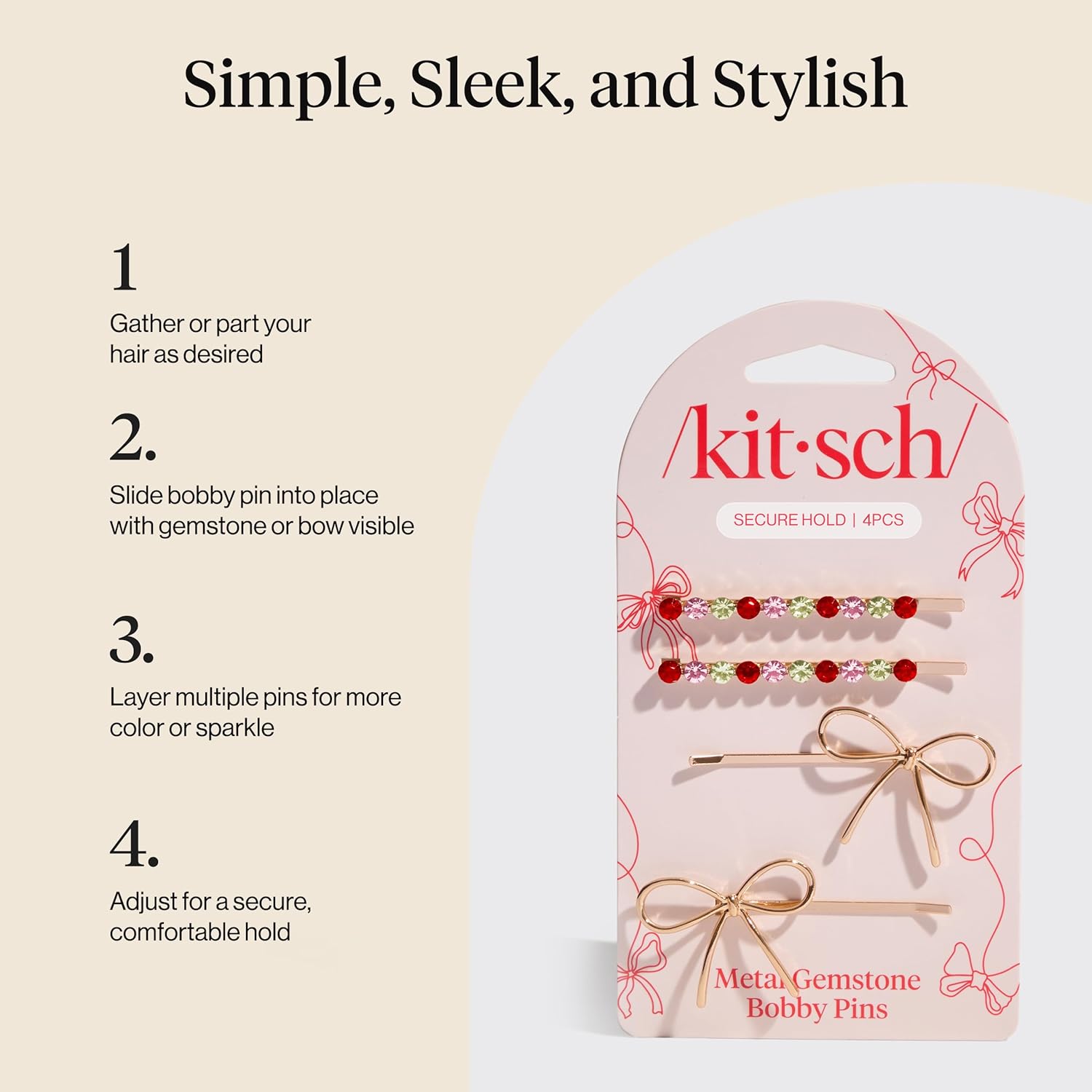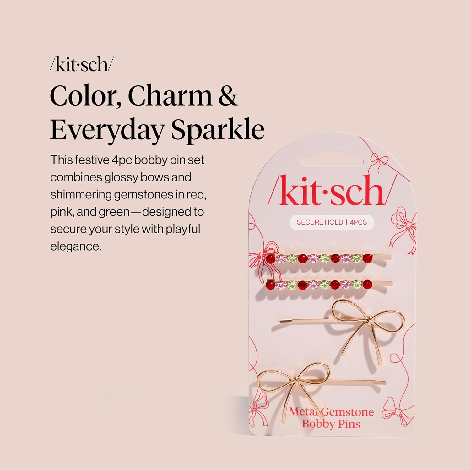 Kitsch Metal Bow & Gemstone Bobby Pins for Women - Stylish Hair Pins for All Hair Types, No-Slip Grip for Secure Hold | Decorative Hair Accessories | Ideal Gifts for Women