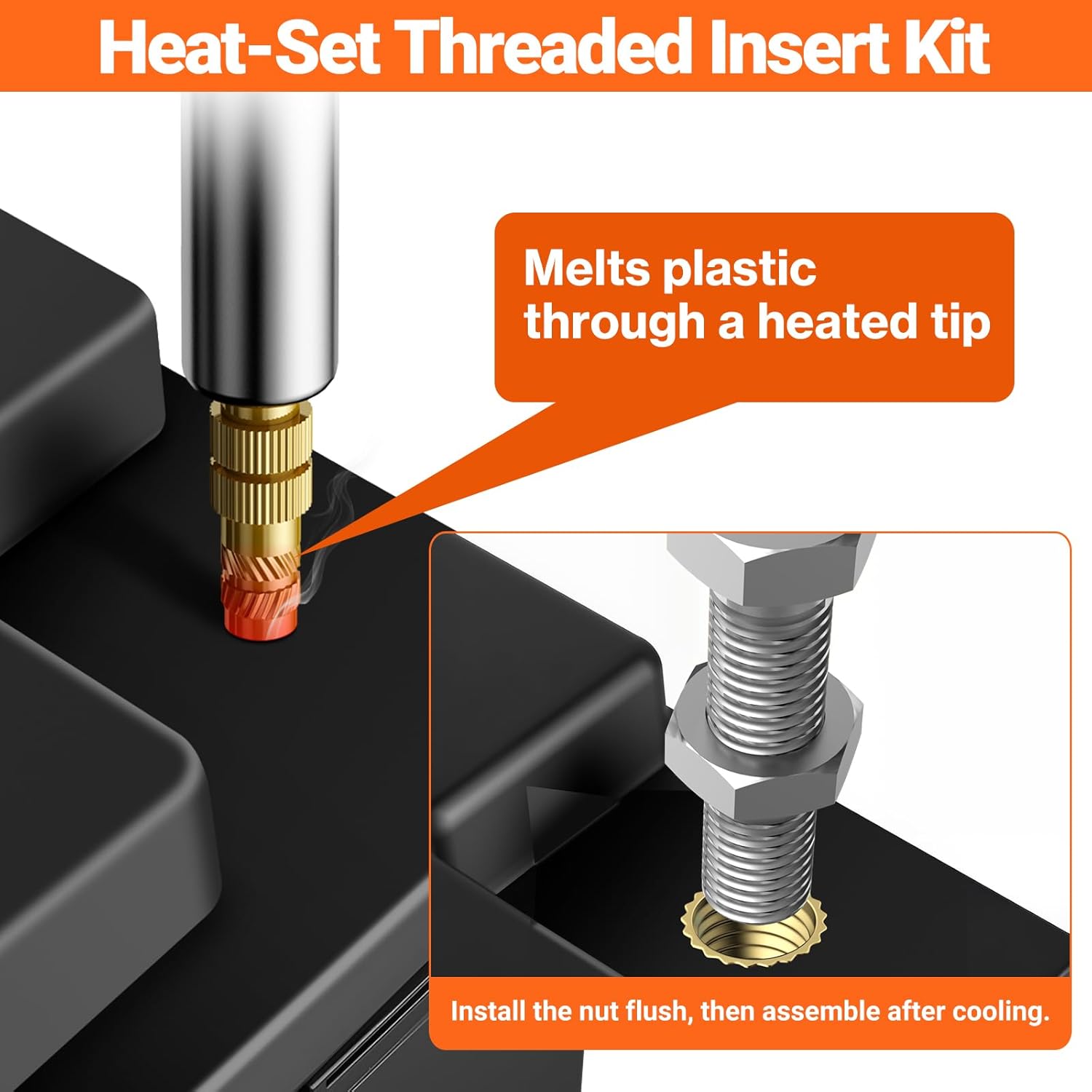 - •Complete Accessories: 5 popular sizes of heat-set inserts with a comprehensive range of installation tools and fasteners. Friendly to DIY enthusiasts, professionals and beginners.