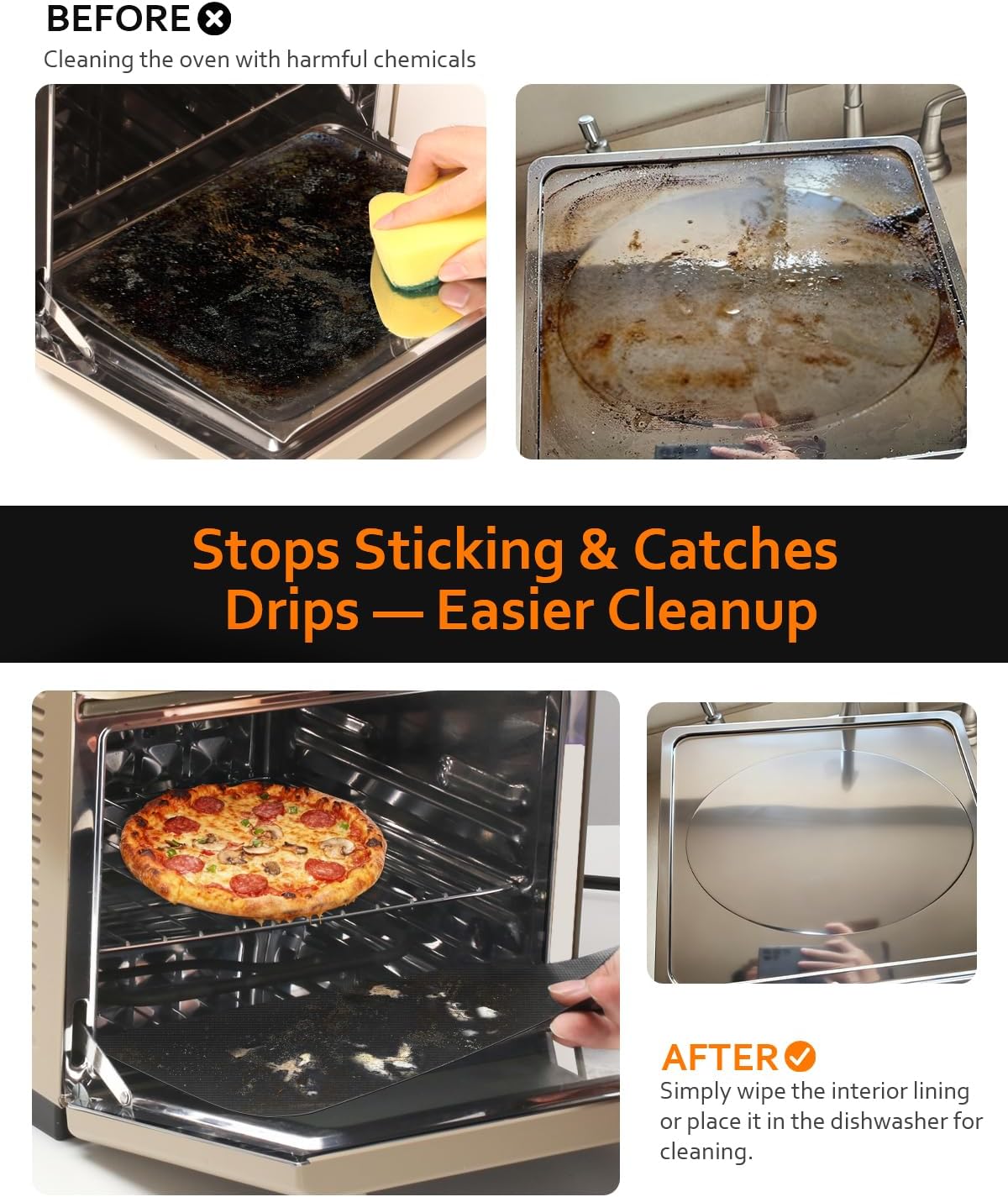 Purpose-built for Wonder Oven cavity, these 2-pack oven liners sit on the crumb tray or lower rack to catch drips and crumbs, cutting down full-cavity cleanups. The PTFE fiberglass surface is rated to 500°F for reliable nonstick performance, while the 0.32 mm thin profile lies flat with minimal impact on heat/airflow. A unique safe-lift tab with hang hole makes removal and storage easy. This is a third-party compatible accessory, Compatible with Our Place Wonder Oven. Do not cover heating elements, vents, or steam ports; follow placement and care guidance Fit: Compatible with Our Place Wonder Oven (third-party accessory; appliance not included) Pack Qty: 2 liners Material: PTFE-coated fiberglass (non-stick, high-heat) Temperature Rating: Up to 500°F (not for open flame/broil/direct contact with heating elements) Thickness: 0.32 mm Color: Black Feature Detail: Safe-lift center tab with hang hole Care: Hand-wash with warm water; avoid steel wool/abrasives Placement: Use on crumb tray/lower rack with clearance; Disclaimer: Third-party compatible accessory, Compatible with Our Place Wonder Oven; not affiliated with or endorsed by the brand.