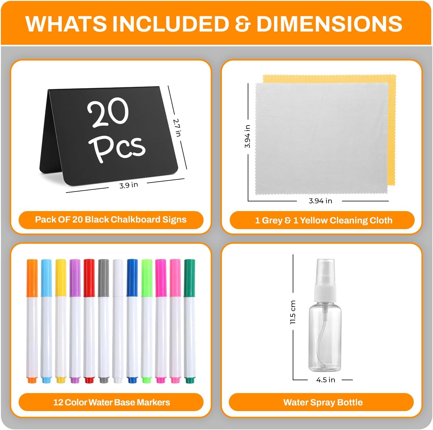 - •𝐏𝐚𝐜𝐤𝐚𝐠𝐞 𝐈𝐧𝐜𝐥𝐮𝐝𝐞𝐬:The package includes 20 mini chalk board signs measuring 4” x 3”, along with 12 Colorful chalks, 2 wiping cloths, and an empty spray bottle for easy cleaning and colorful labeling