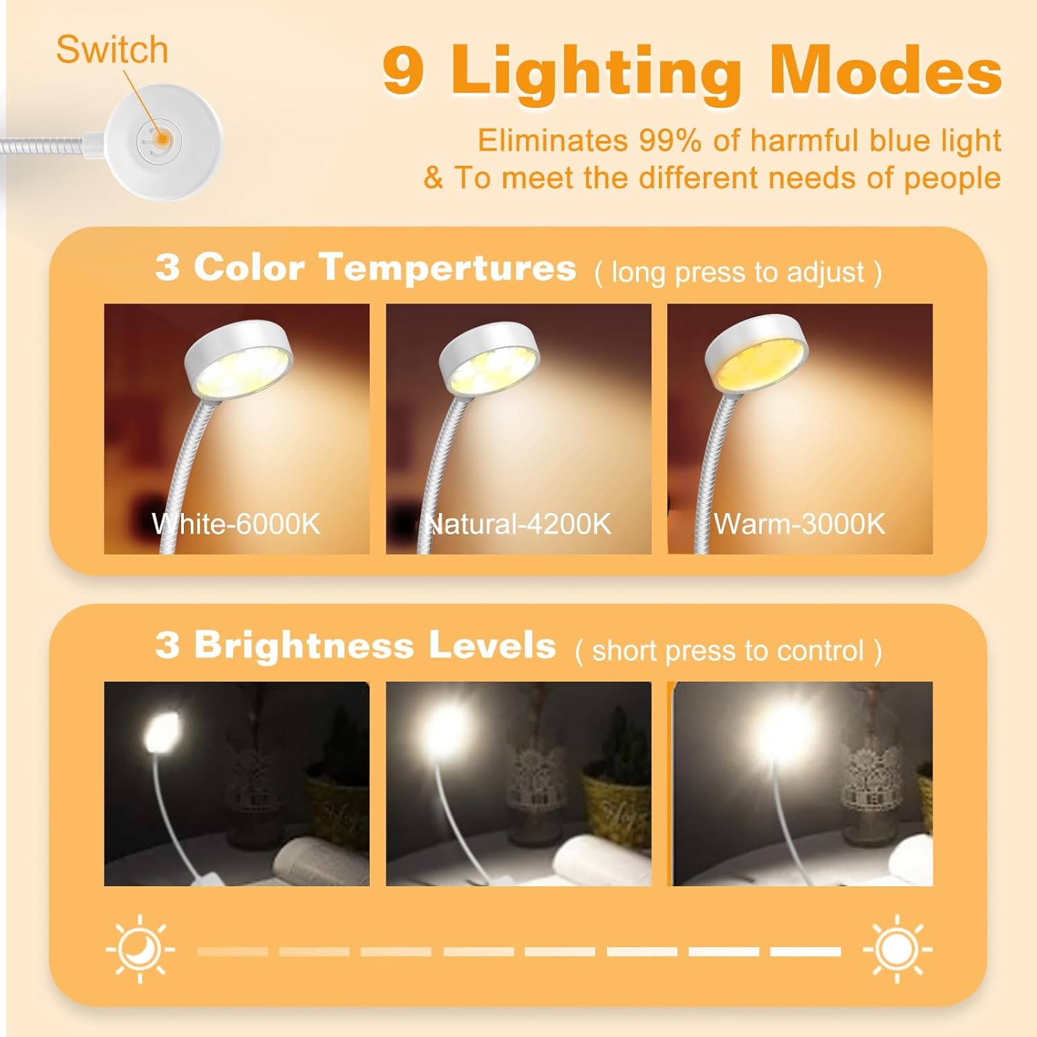 Rechargeable Clip-On Book Light, 10-LED Bed Reading Lamp with 3 Color & 3 Brightness, USB-C, Up to 30-Hour Runtime, 360° Gooseneck, Ultralight 1.4oz, Great Stocking Stuffers, Black & White