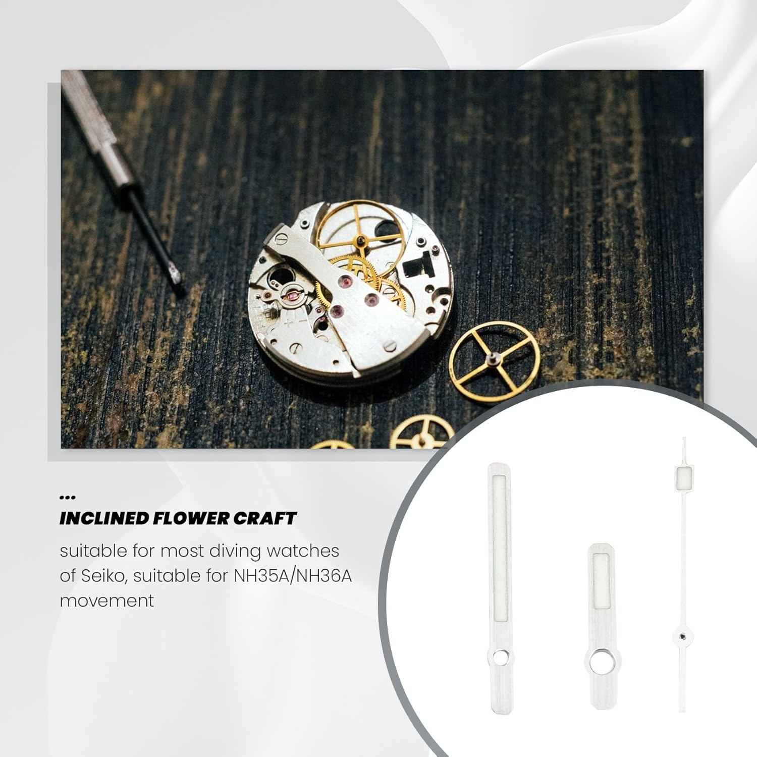 Kopinma Compatible movement: for NH35 NH36(7s26, 7s36, 7s25, 7s35, 6r15, 4r15, 4r35, 4r36, 6309, 7002, 7009) for ETA 2824 2836 PT5000 ST2130 Size: 7.5 mm x 12 13.5 mm ( All measure from the center of hole to ) Colour:silver Material:Metal Package Contents: 1 x Watch Hand Needle set Only the above package content, other products are not included. Note: Light and different displays may cause the color of the item in the picture a little different from the real thing. The measurement allowed error is +/- 1-3cm.